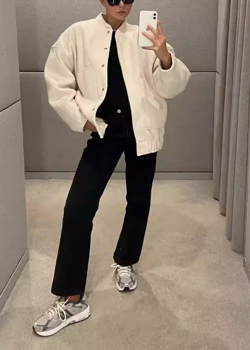 Simple Grey Stand Collar Pockets Woolen Jacket Fall