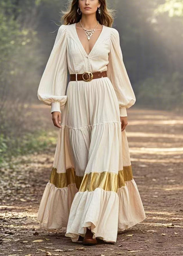 Style White V Neck Patchwork Exra Large Hem Tunic Dress Lantern Sleeve