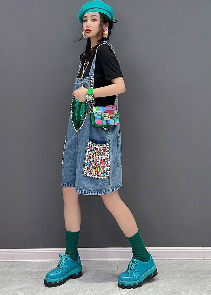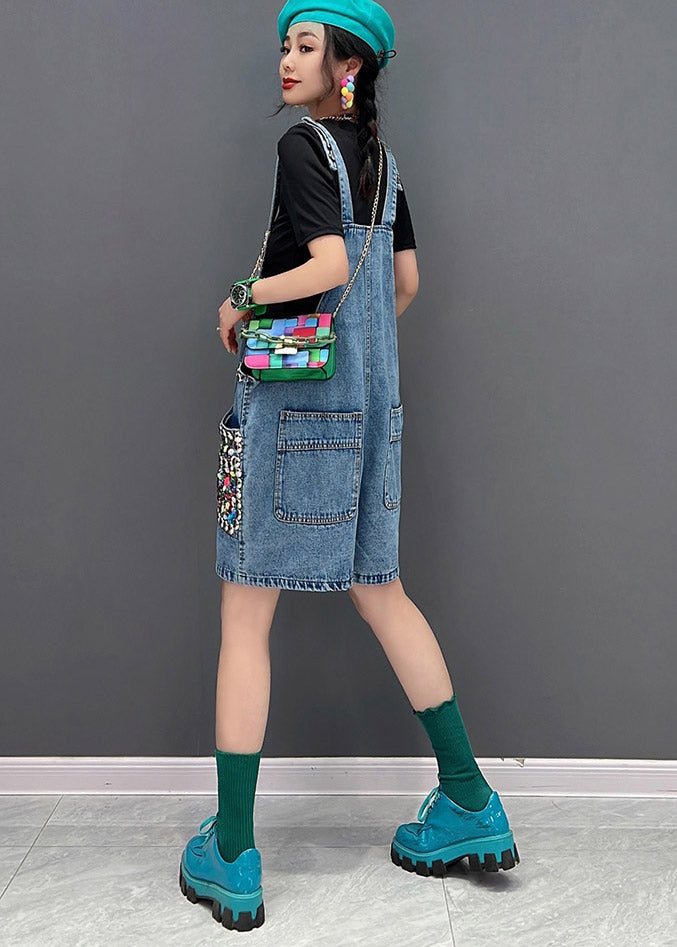 Stylish Blue Slash Neck Pockets Sequins Jumpsuit Summer