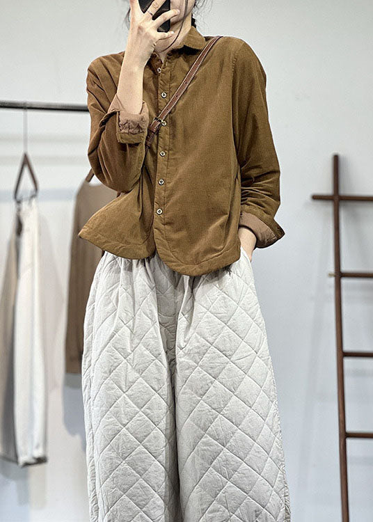 Stylish Chocolate Peter Pan Collar Pockets Contton Filled Corduroy Coats Winter