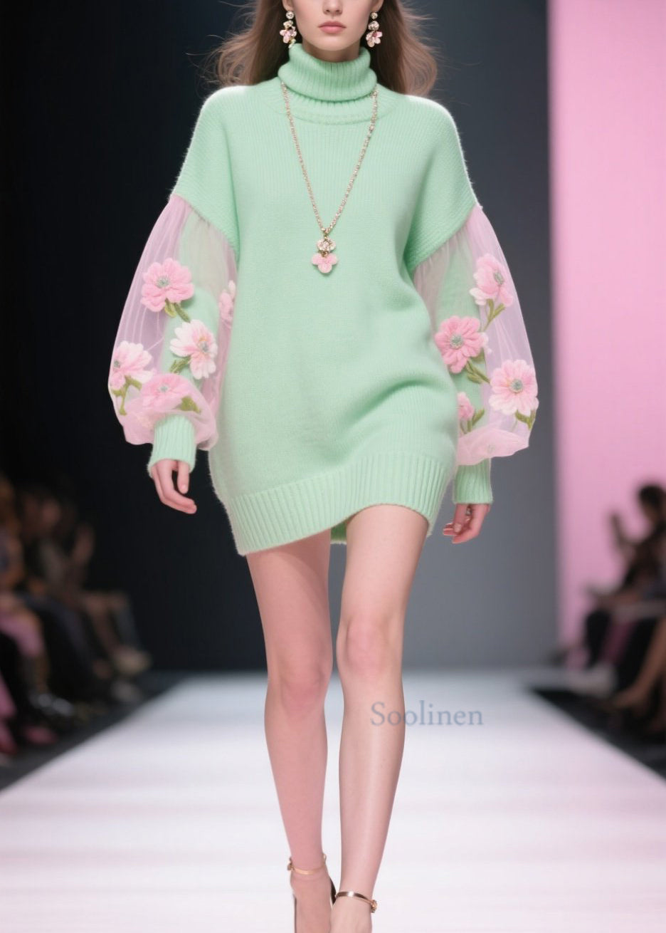 Stylish Hign Neck Tulle Patchwork Knit Sweater Dress Winter