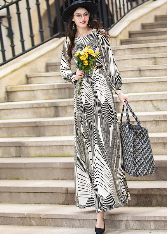 Stylish White O-Neck Striped Exra Large Hem Chiffon Cinch Dress Spring