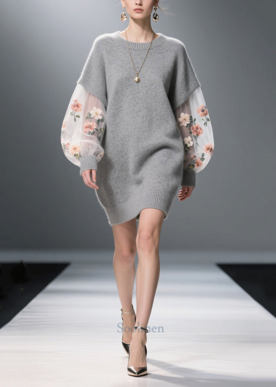 Unique Grey Daisy Patchwork Tulle Long Sweater Fall