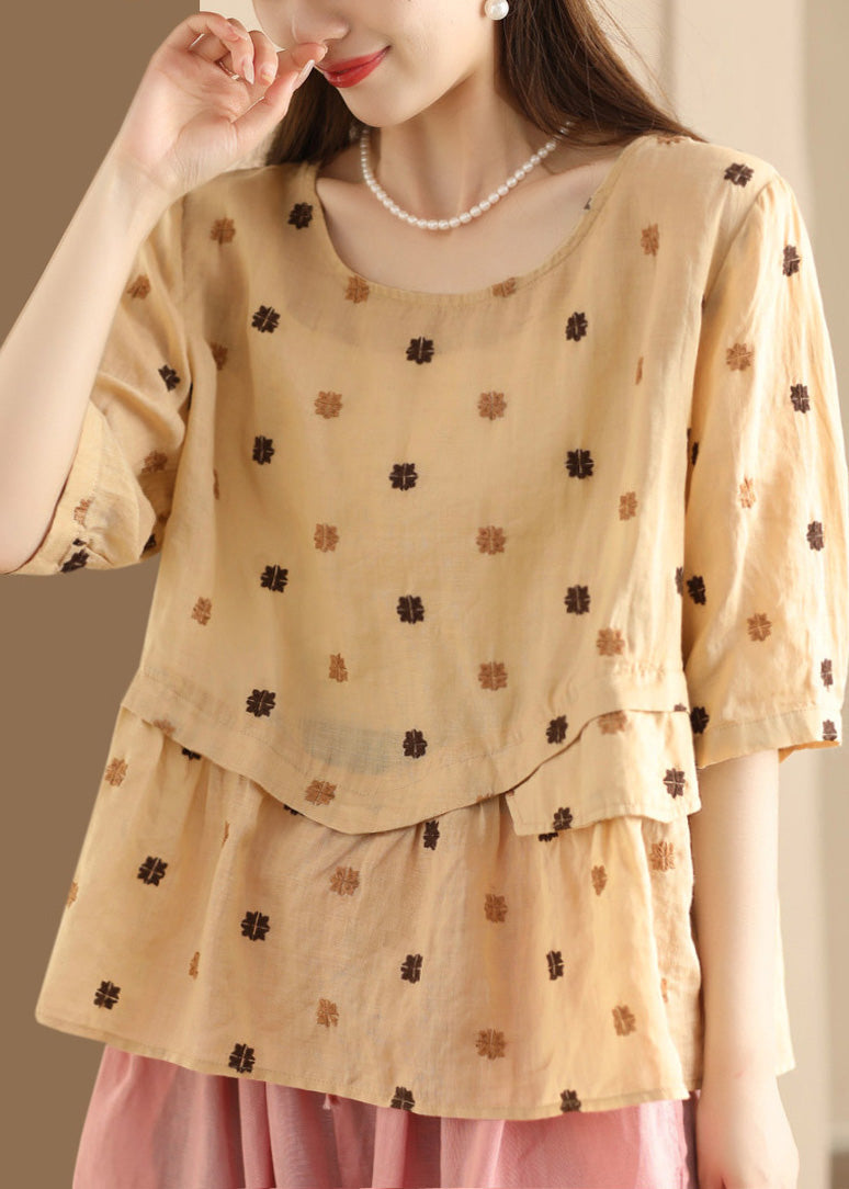 Unique Purple O Neck Embroidered Patchwork Linen Blouses Summer