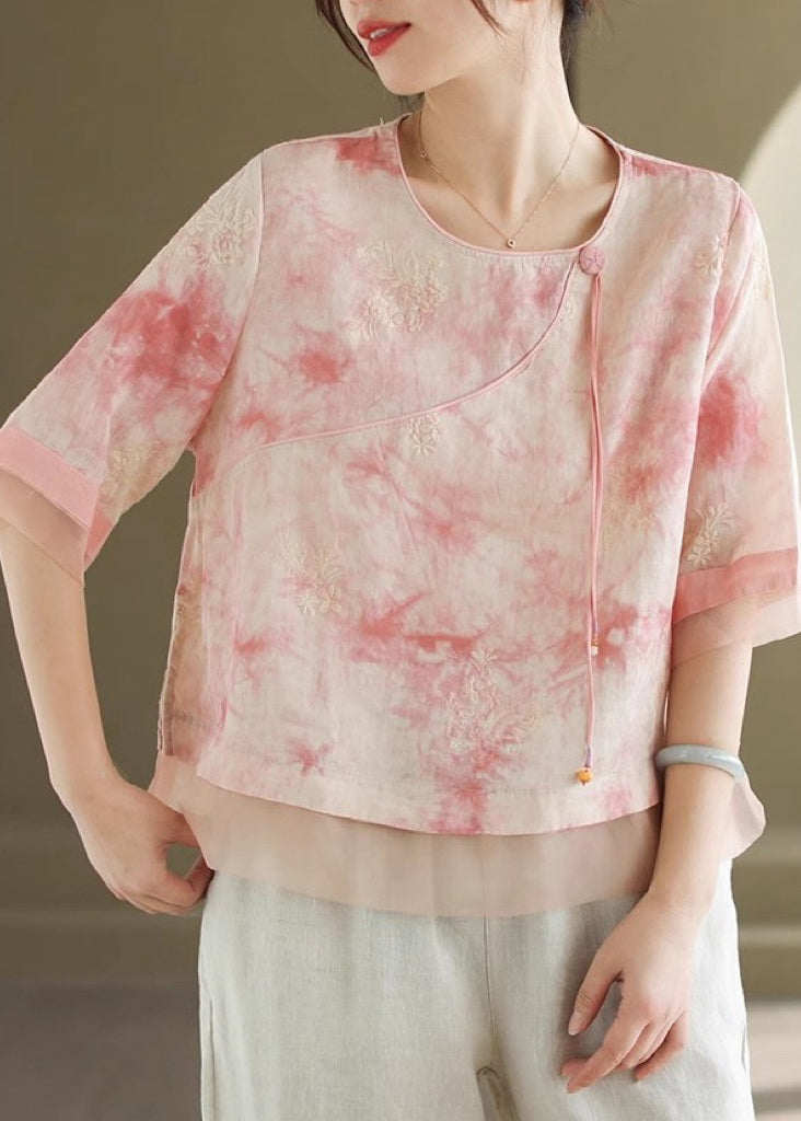 Vintage Light Green O Neck Tasseled Embroidered Linen Shirts Summer