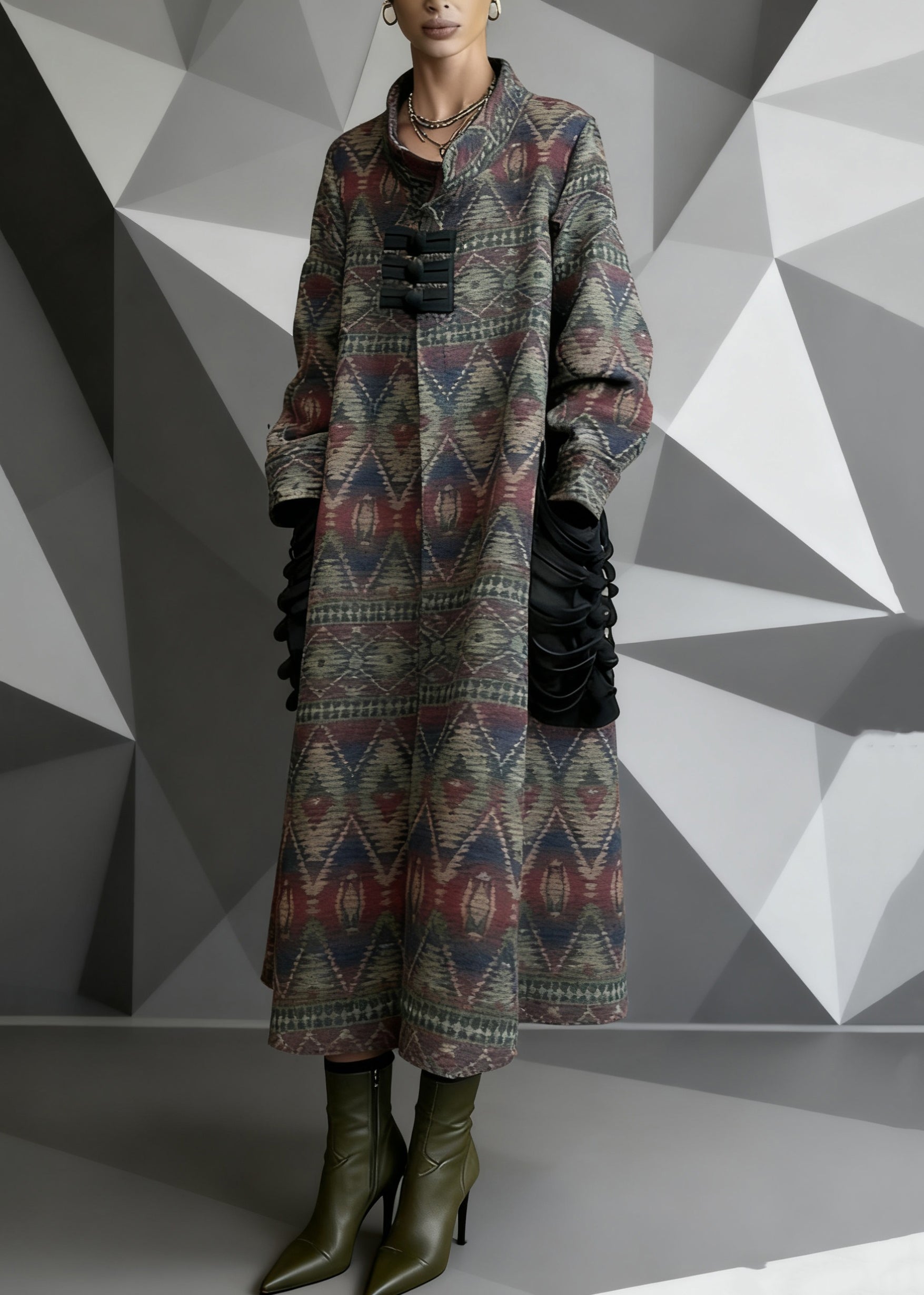 Vintage Print Pockets Patchwork Woolen Long Coat Spring