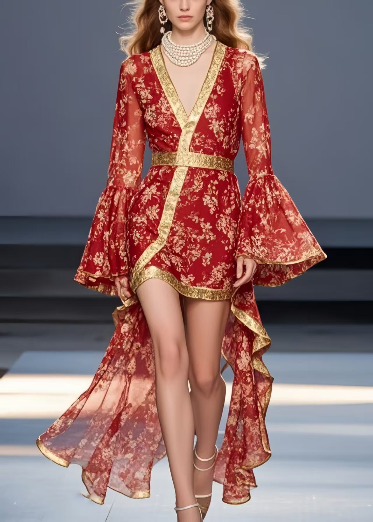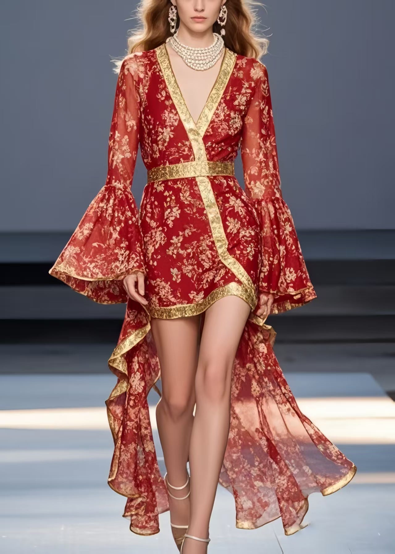 Vintage Red Print Asymmetrical Design Chiffon Mid Dress Flare Sleeve