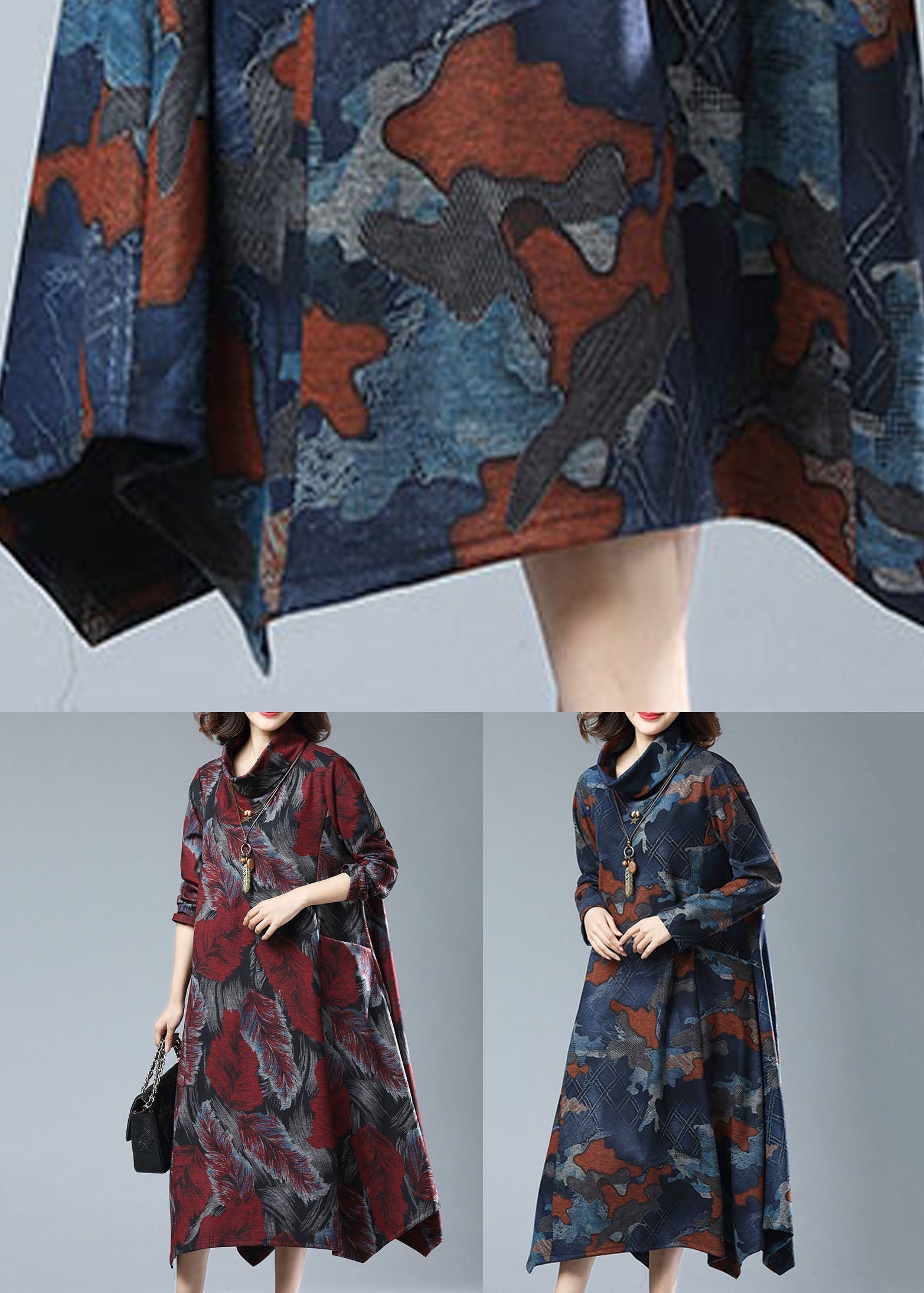 Wine Red Patchwork Cotton Dress Turtleneck Print Pockets Long Sleeve