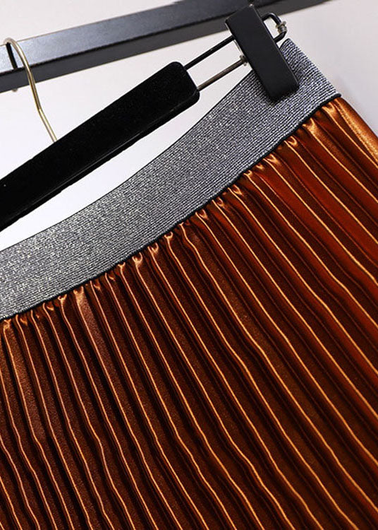 Women Brown Elastic Waist Patchwork Velour Pleated Skirt Fall