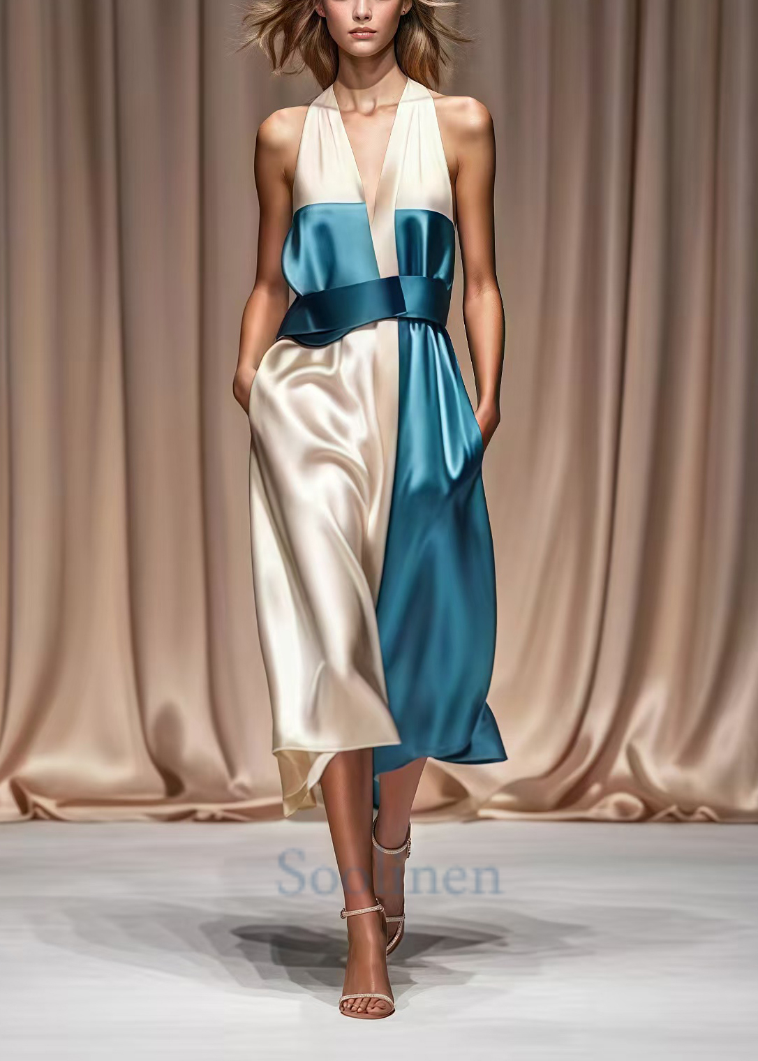 Women Colorblock Cold Shoulder Patchwork Silk Halter Dresses Summer