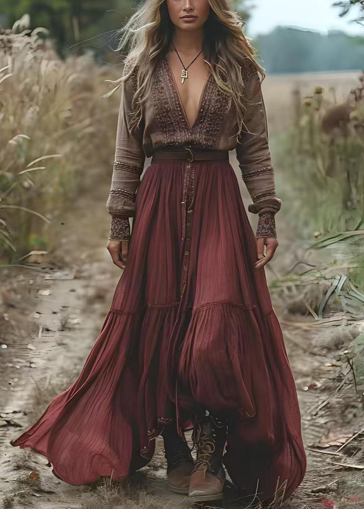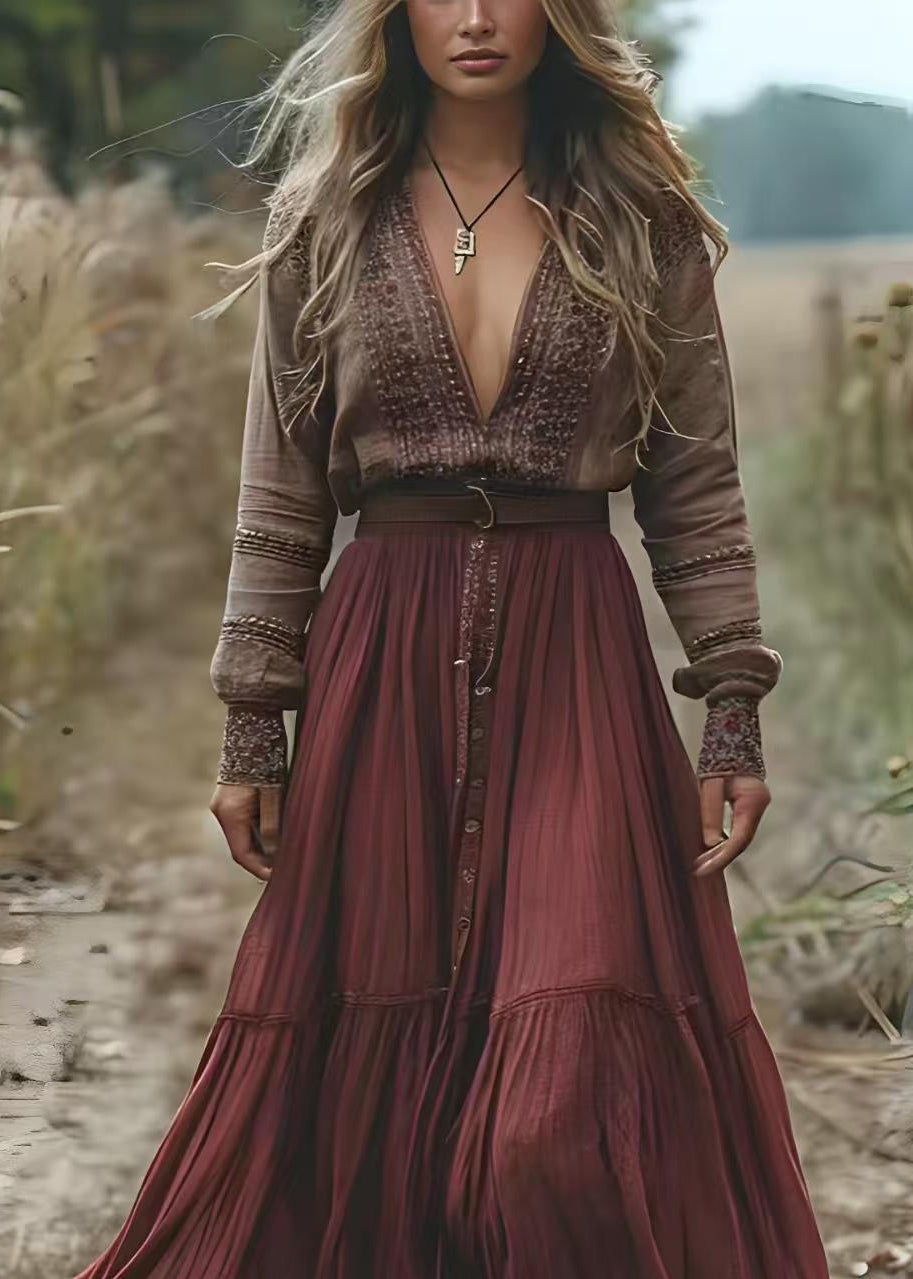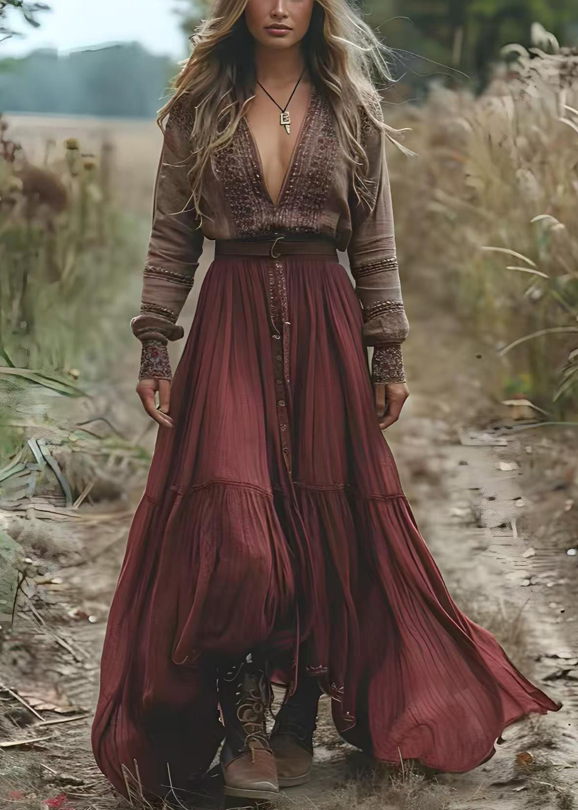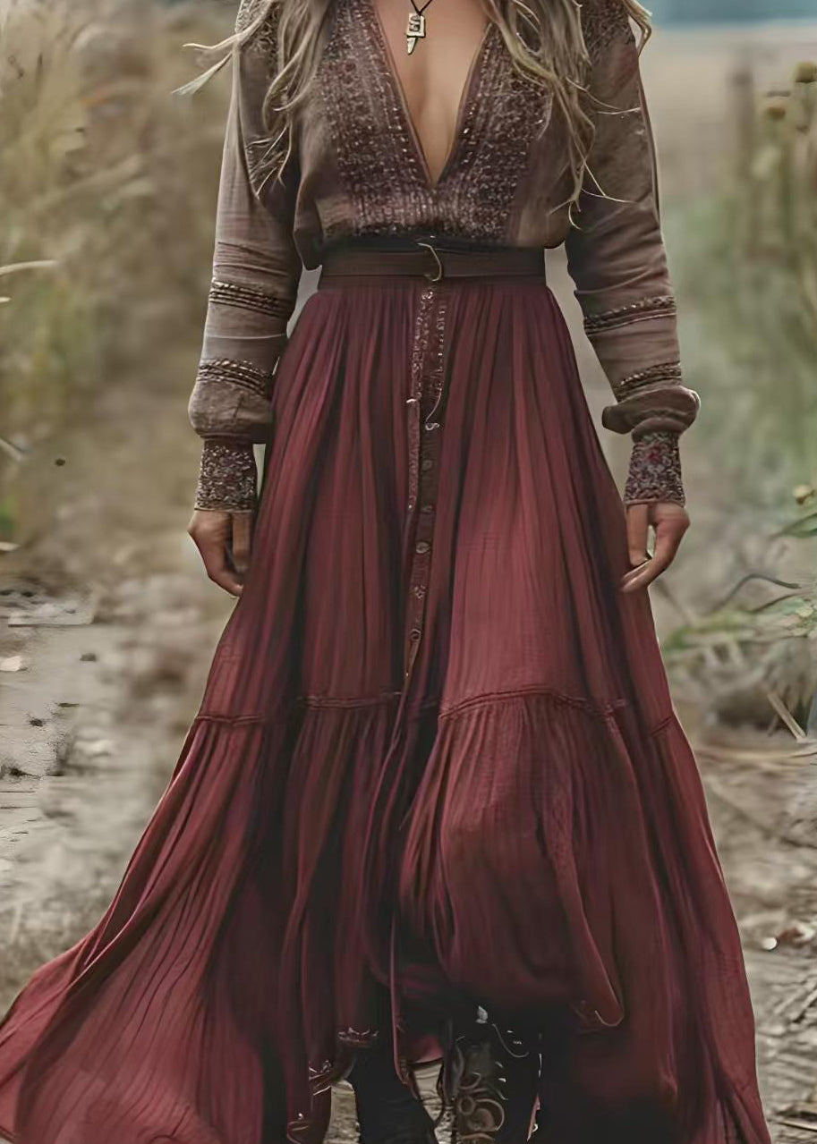 Women Colorblock V-Neck Print Patchwork Cotton Long Dress Spring