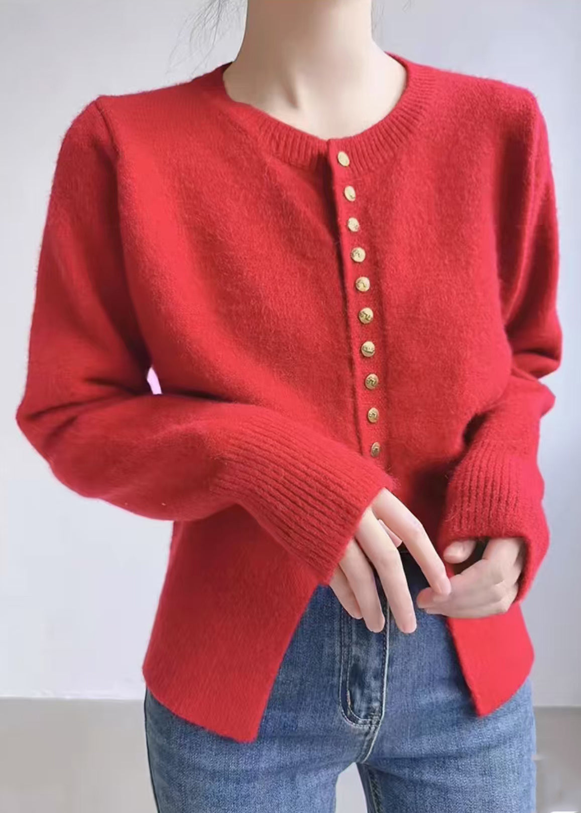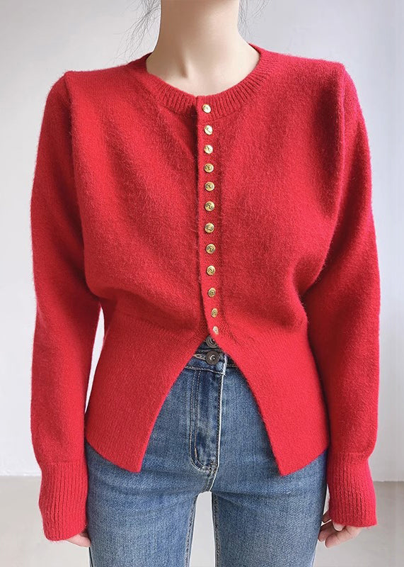 Women Red O Neck Button Solid Knit Coats Spring