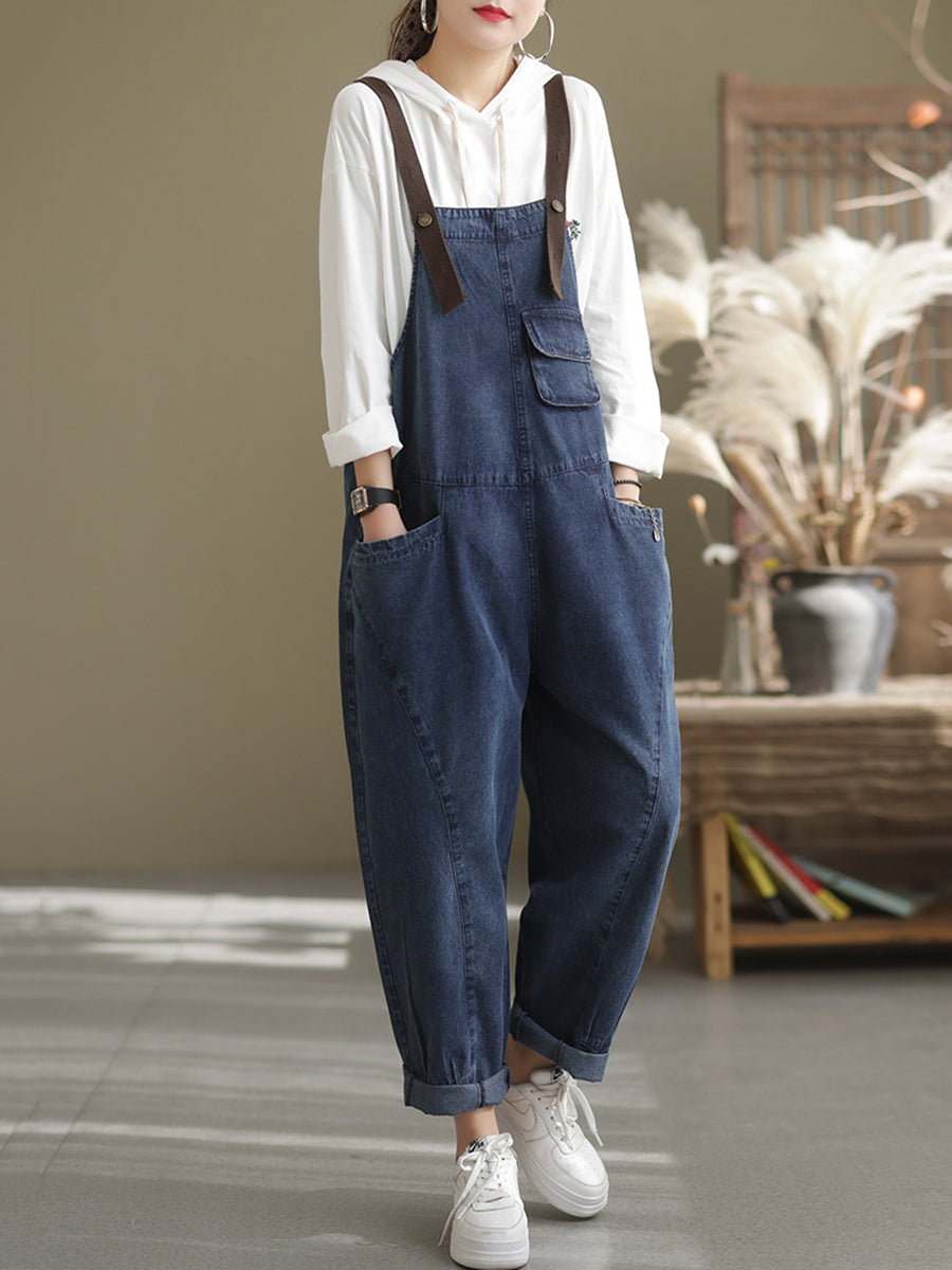 Women Retro Solid Pocket Button Washed Loose Denim Jumpsuits