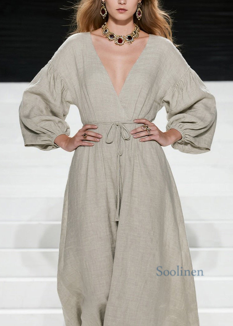 Women V Neck Lace Up Patchwork Cotton Long Dress Fall