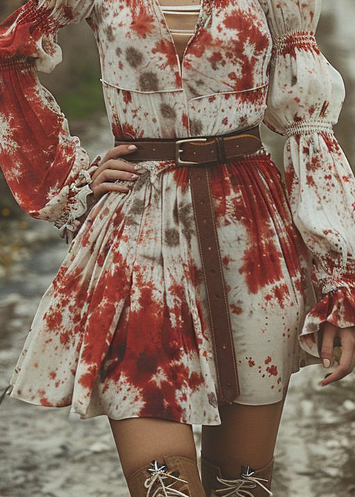 Women V Neck Tie Dye Pastoral Style Mid Dress Flare Sleeve