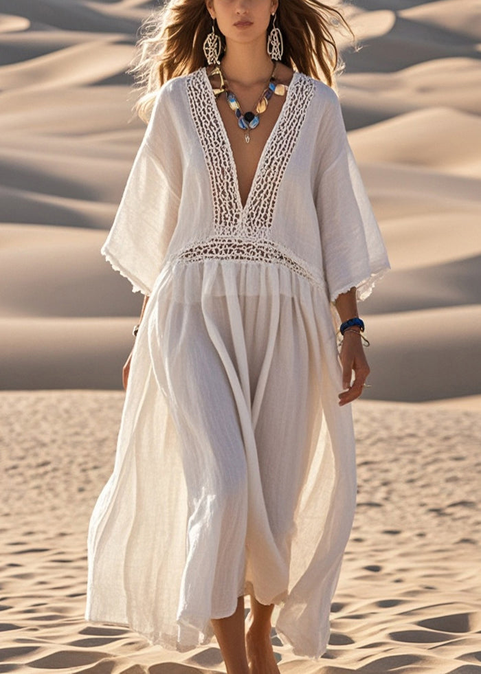 Women White Oversized Patchwork Hollow Out Cotton Dress Bracelet Sleeve