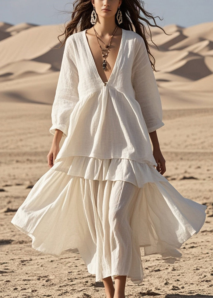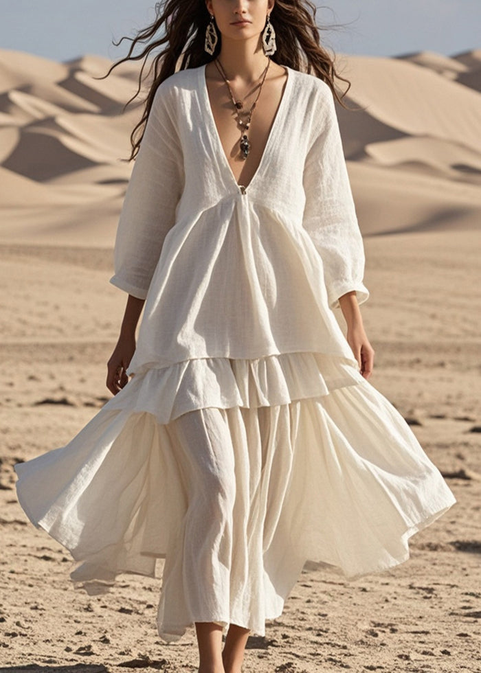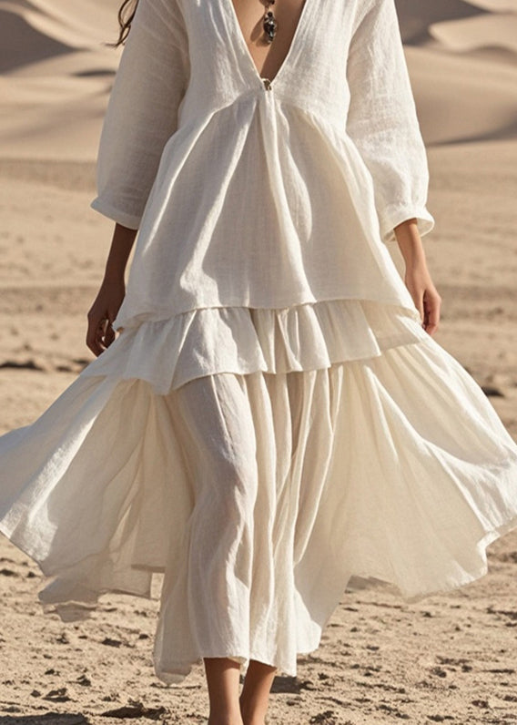 Women White V Neck Patchwork Cotton Ankle Dress Bracelet Sleeve