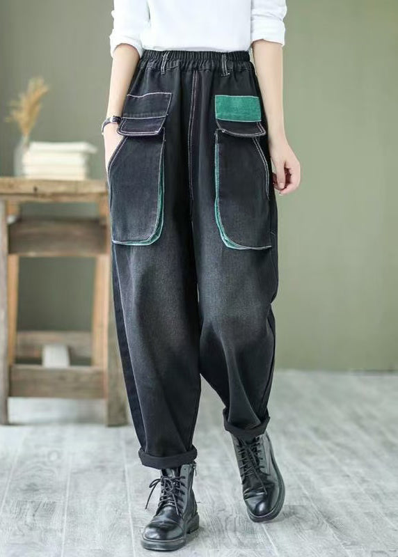 Art Black Elastic Waist Patchwork Pockets Denim Harem Pants Spring