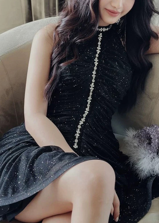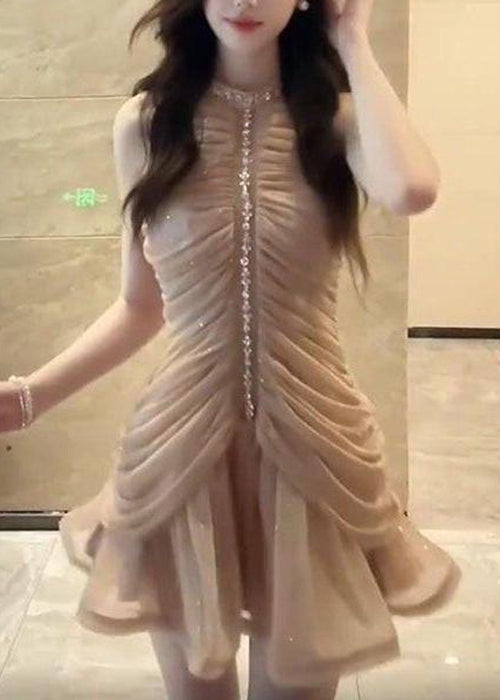 Art Naked Color Zippered Zircon Wrinkled Chiffon Dress Sleeveless