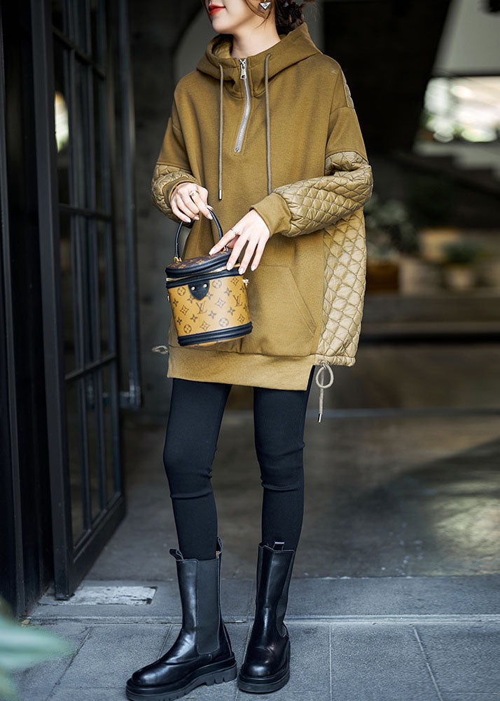 Art Yellow Hooded Drawstring Patchwork Fine Cotton Filled Sweatshirts Top Winter