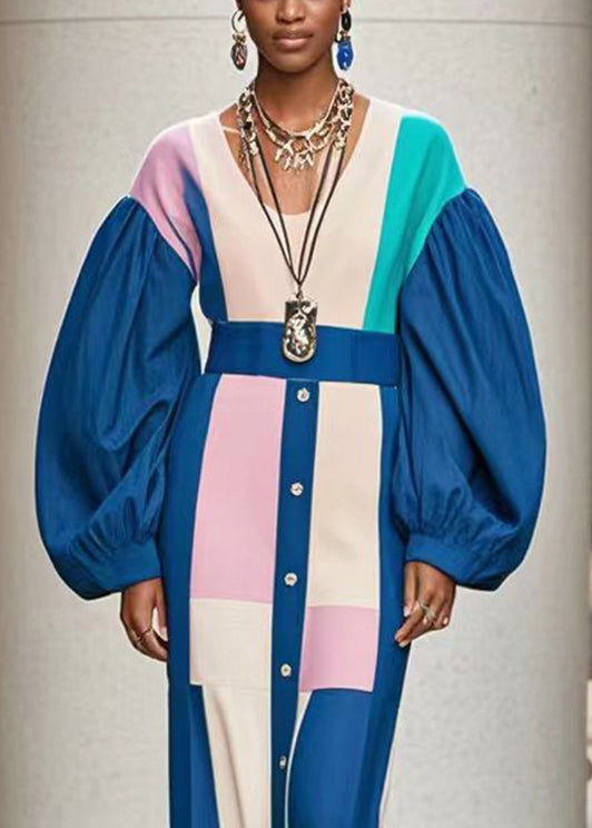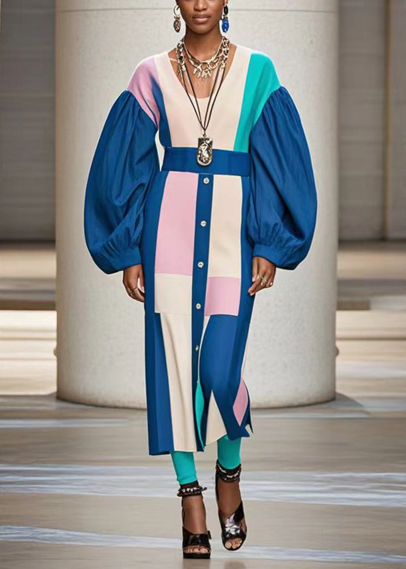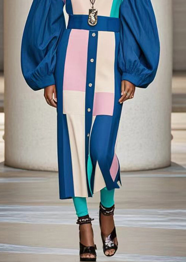 Beautiful Blue O-Neck Patchwork Cotton Dresses Lantern Sleeve
