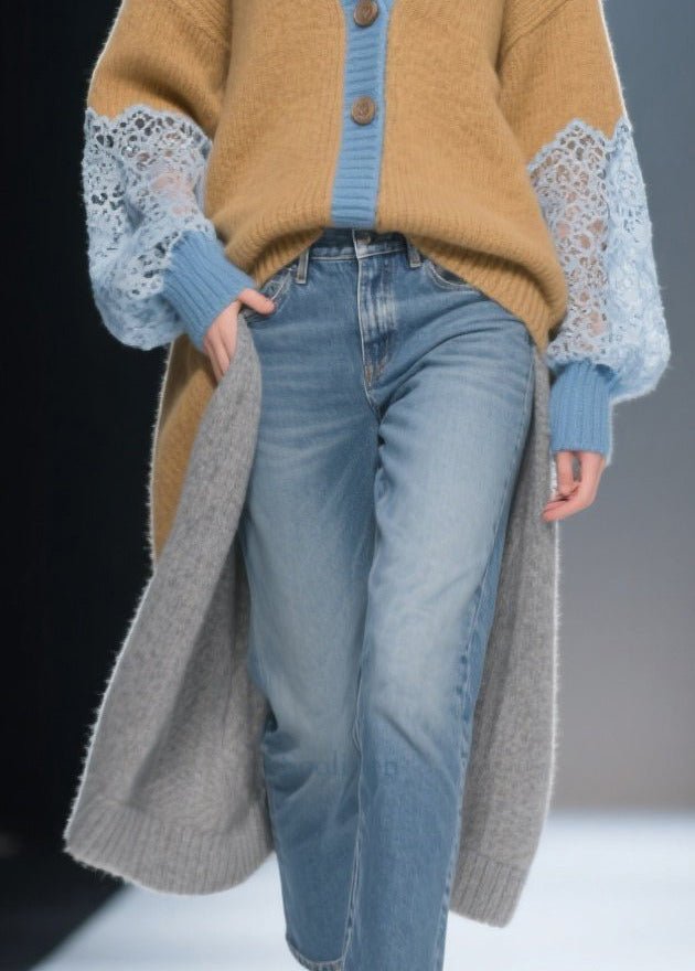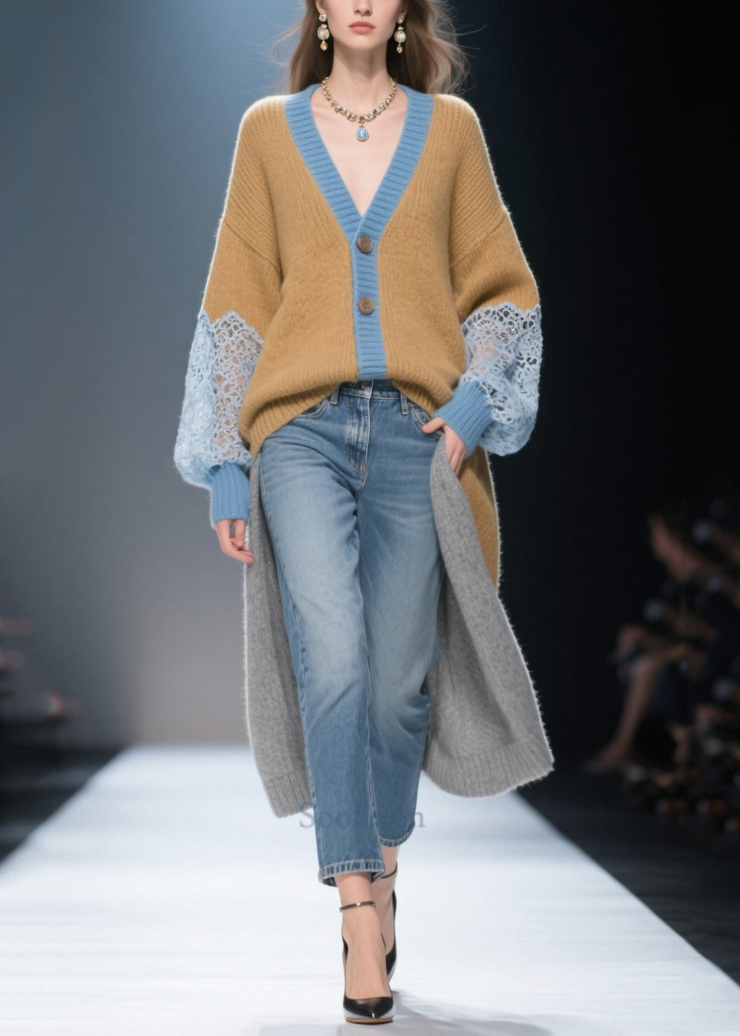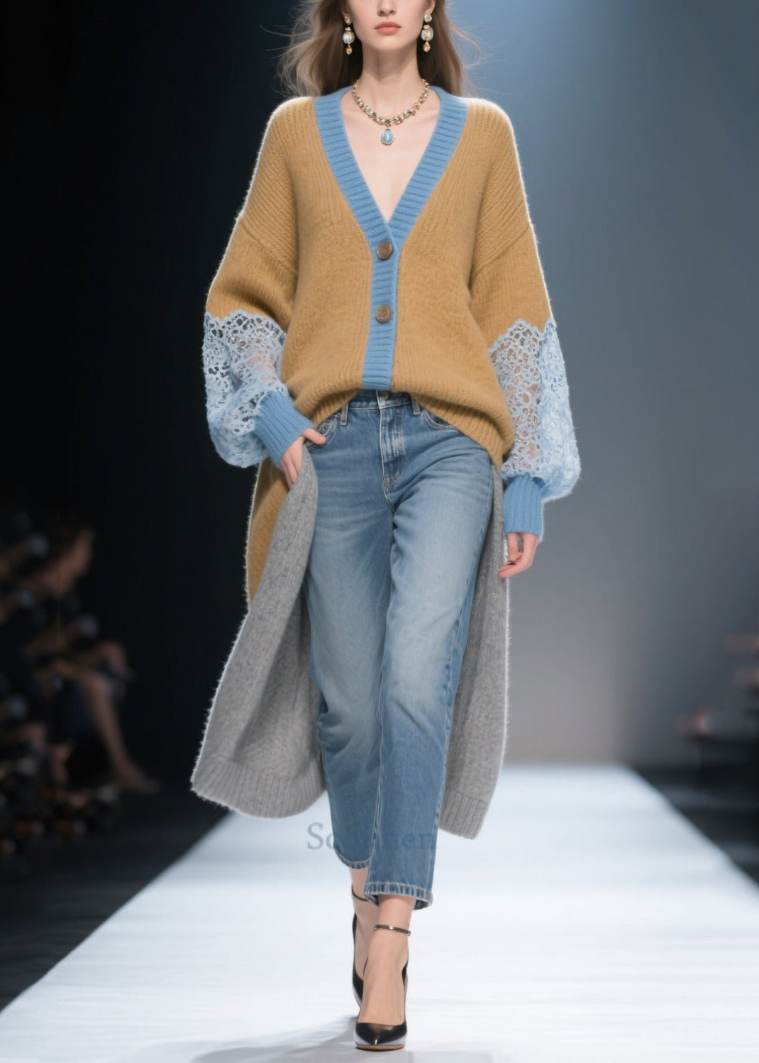Beautiful Brown Low High Design Patchwork Lace Knit Cardigans Winter