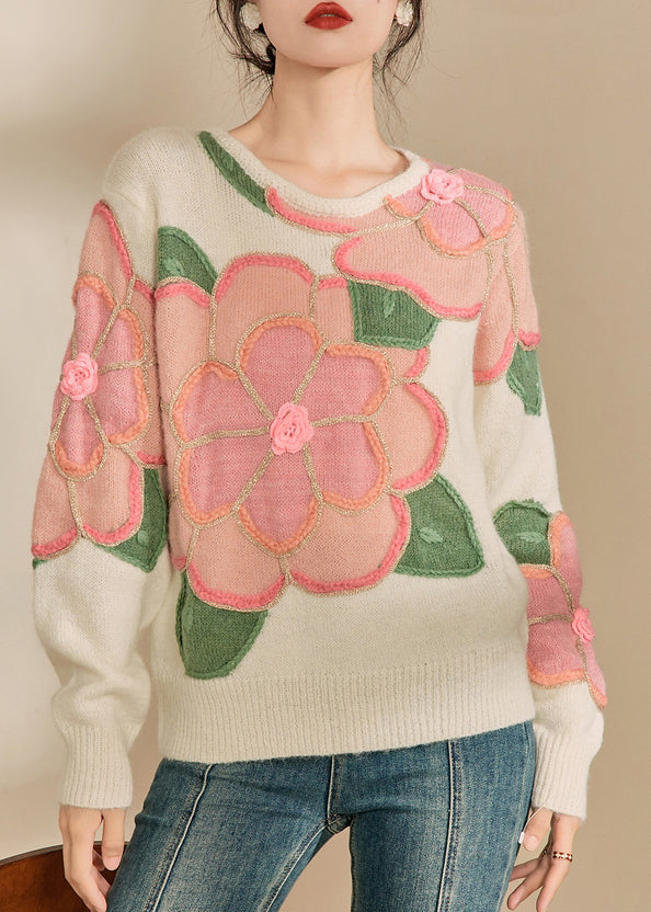Beautiful Pink Floral Patchwork Cozy Cotton Knit Sweaters Fall