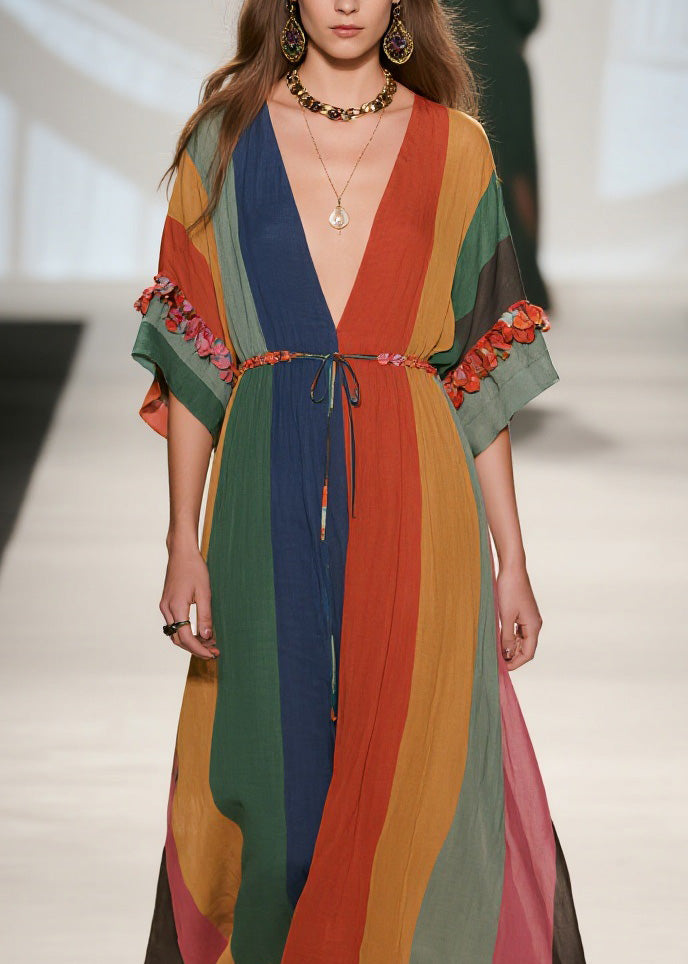 Beautiful V Neck Floral Patchwork Lace Up Cotton Dresses Summer