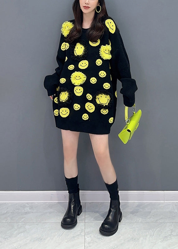 Black Patchwork Knit Sweater Mid Dress Ruffled O Neck Fall