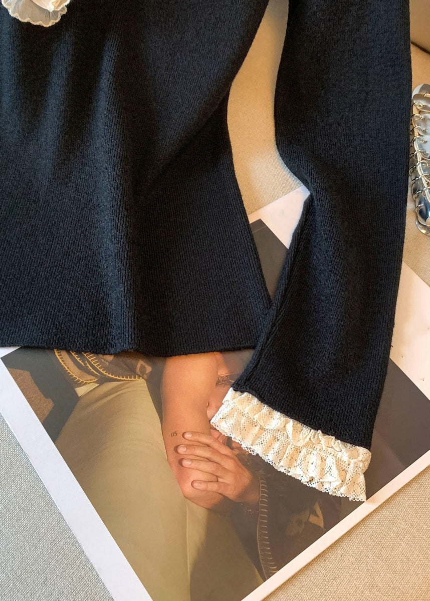 Black Ruffled Patchwork Knitting Cotton Fall T Shirts V Neck