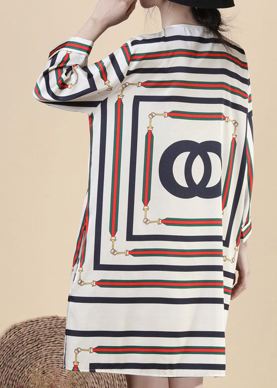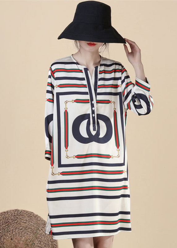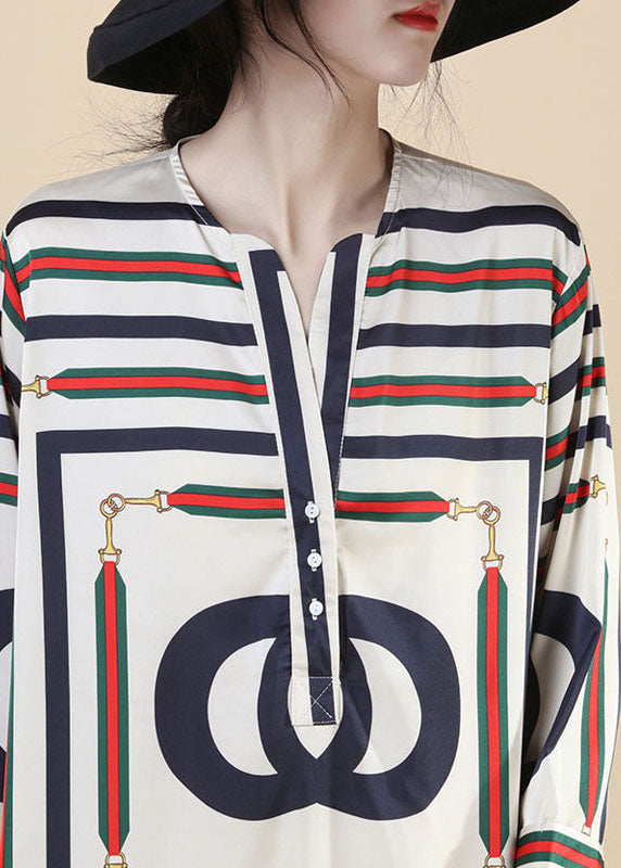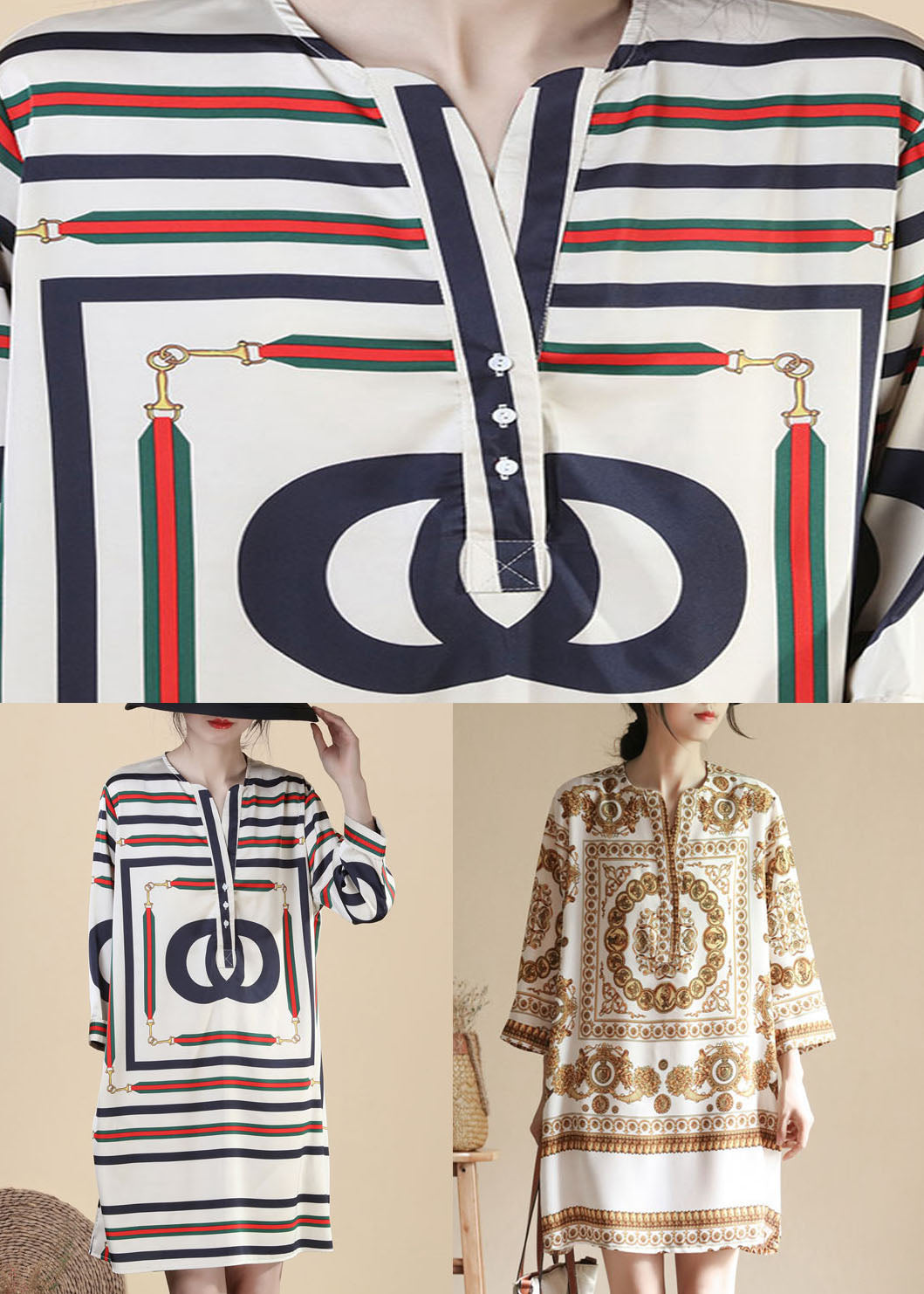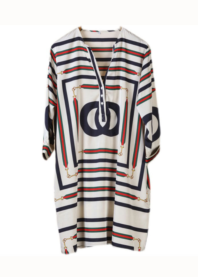 Blue Print Patchwork Silk Dress V Neck Bracelet Sleeve