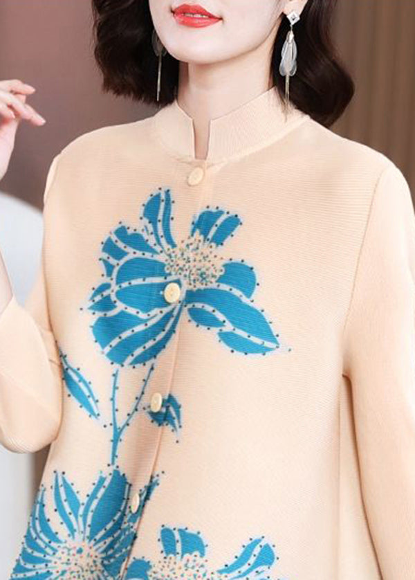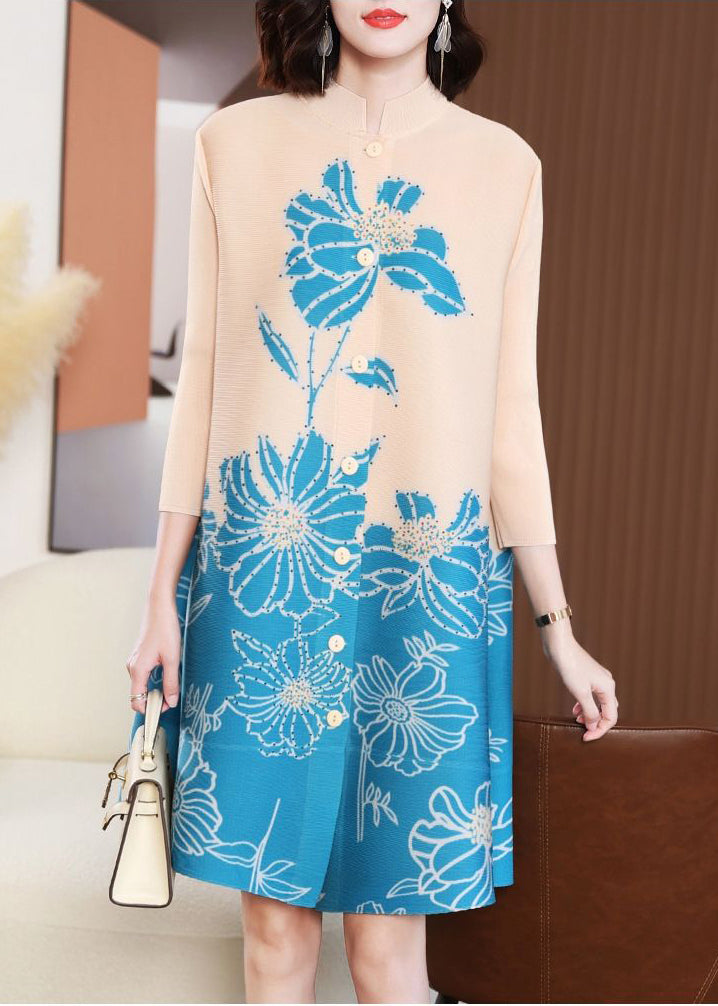 Blue Print Shirt Dresses Stand Collar Wrinkled Bracelet Sleeve