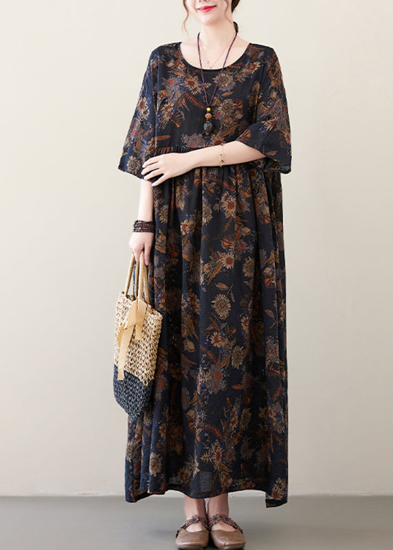 Blue Print Wrinkled Vacation Long Dresses Half Sleeve