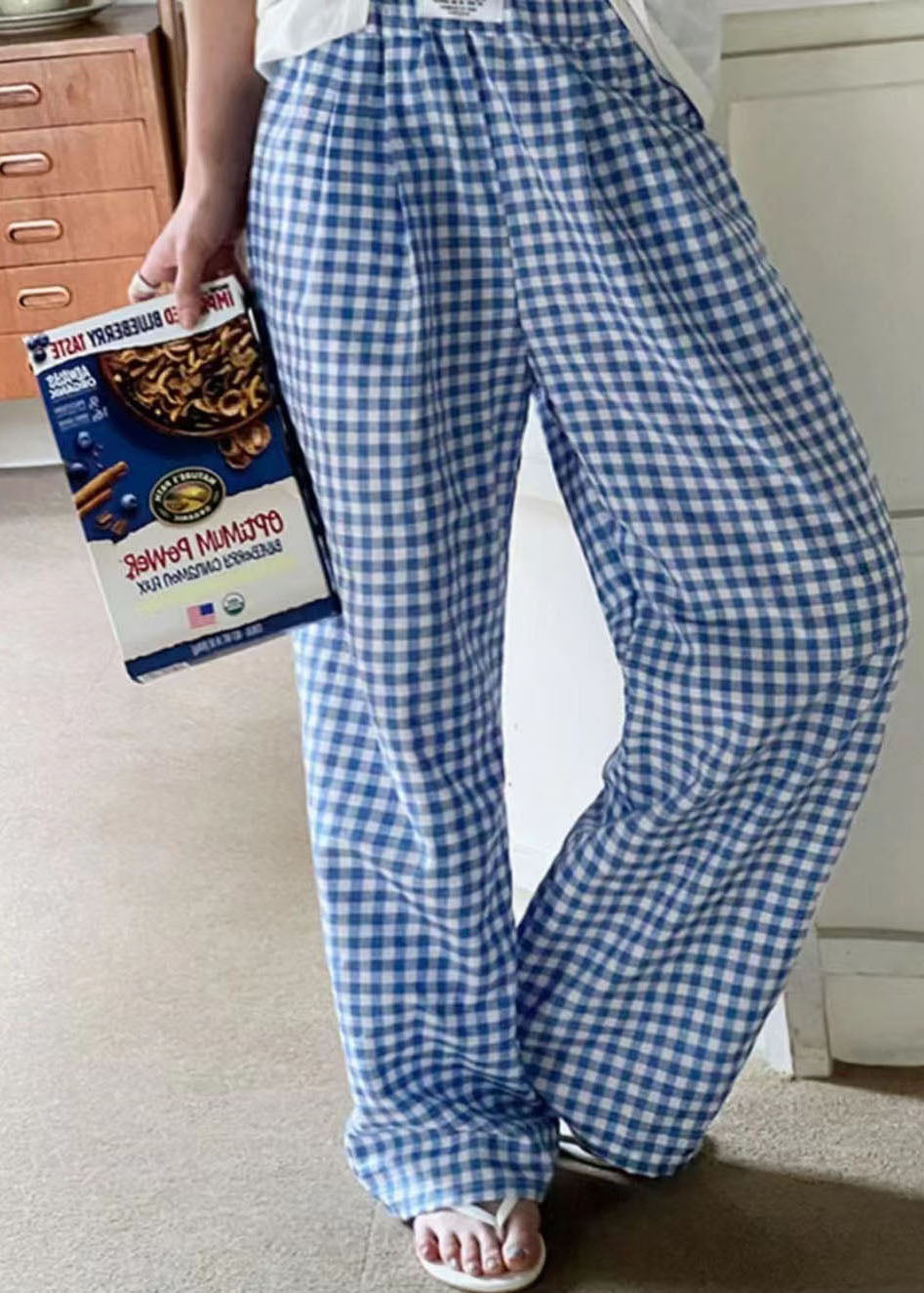Bohemian Black Elastic Waist Plaid Linen Wide Leg Pants Spring