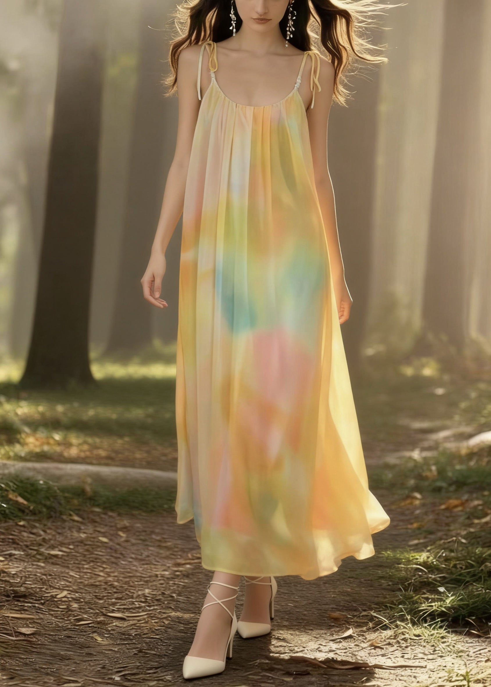 Bohemian Yellow Tie Dye Backless Chiffon Spaghetti Strap Dress Sleeveless