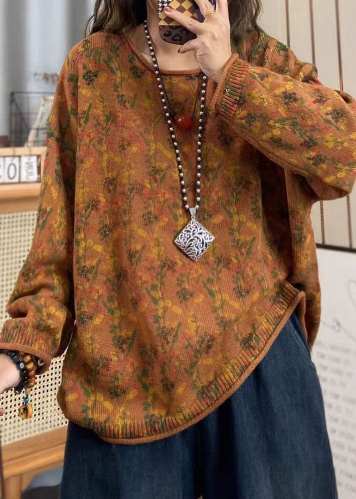 Boho Red O Neck Print Cotton Knit Loose Sweaters Top Spring
