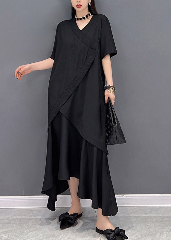 Boutique Black V Neck Asymmetrical Patchwork Long Dress Short Sleeve
