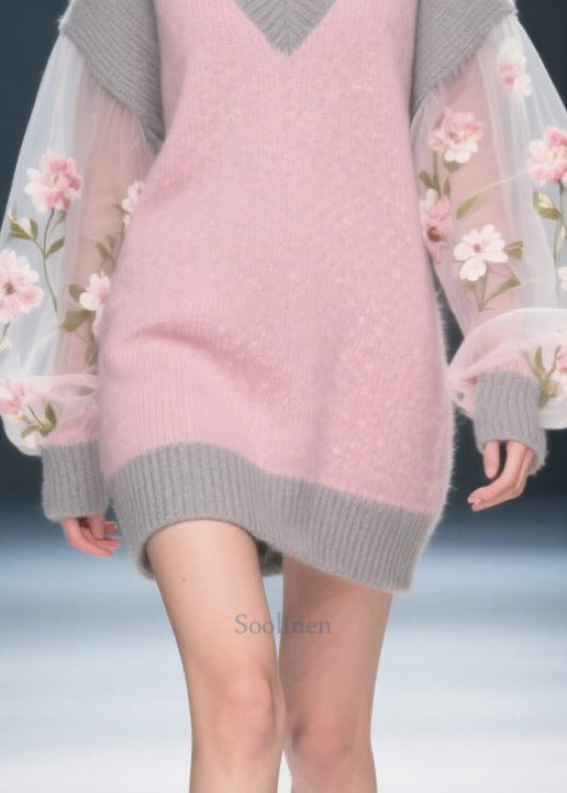 Boutique Colorblock V Neck Patchwork Tulle Knitwear Dress Winter