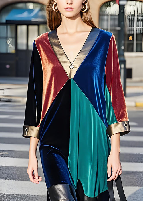 Boutique Colorblock V Neck Patchwork Velvet Dresses Fall