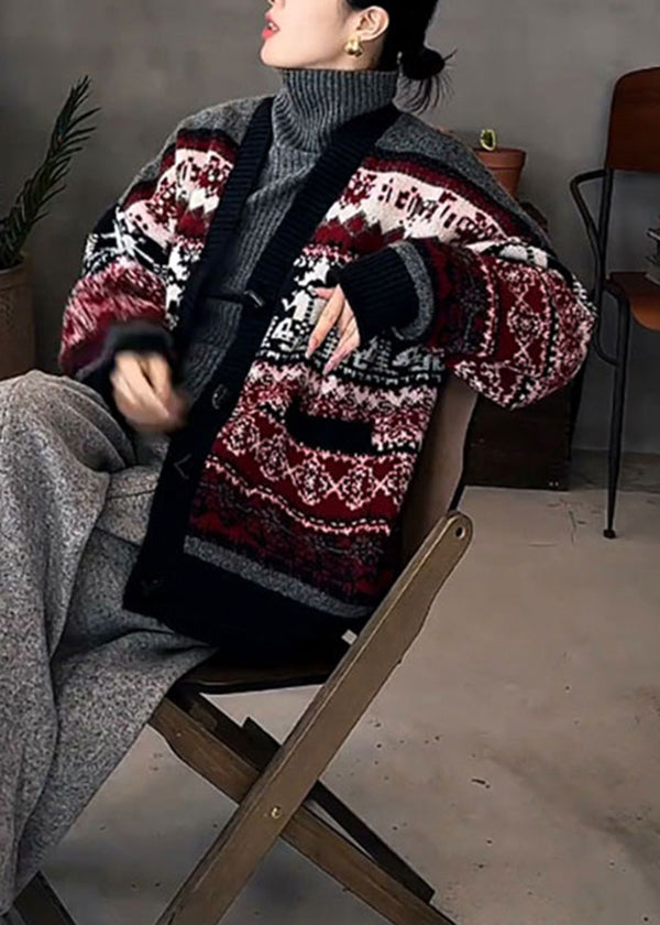 Boutique Red V Neck Jacquard Knit Cardigan Spring