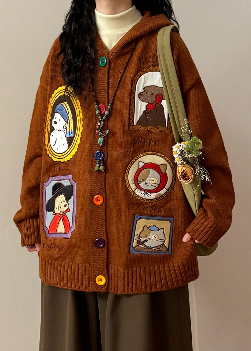 Casual Brown Hooded Applique Button Knit Coats Spring