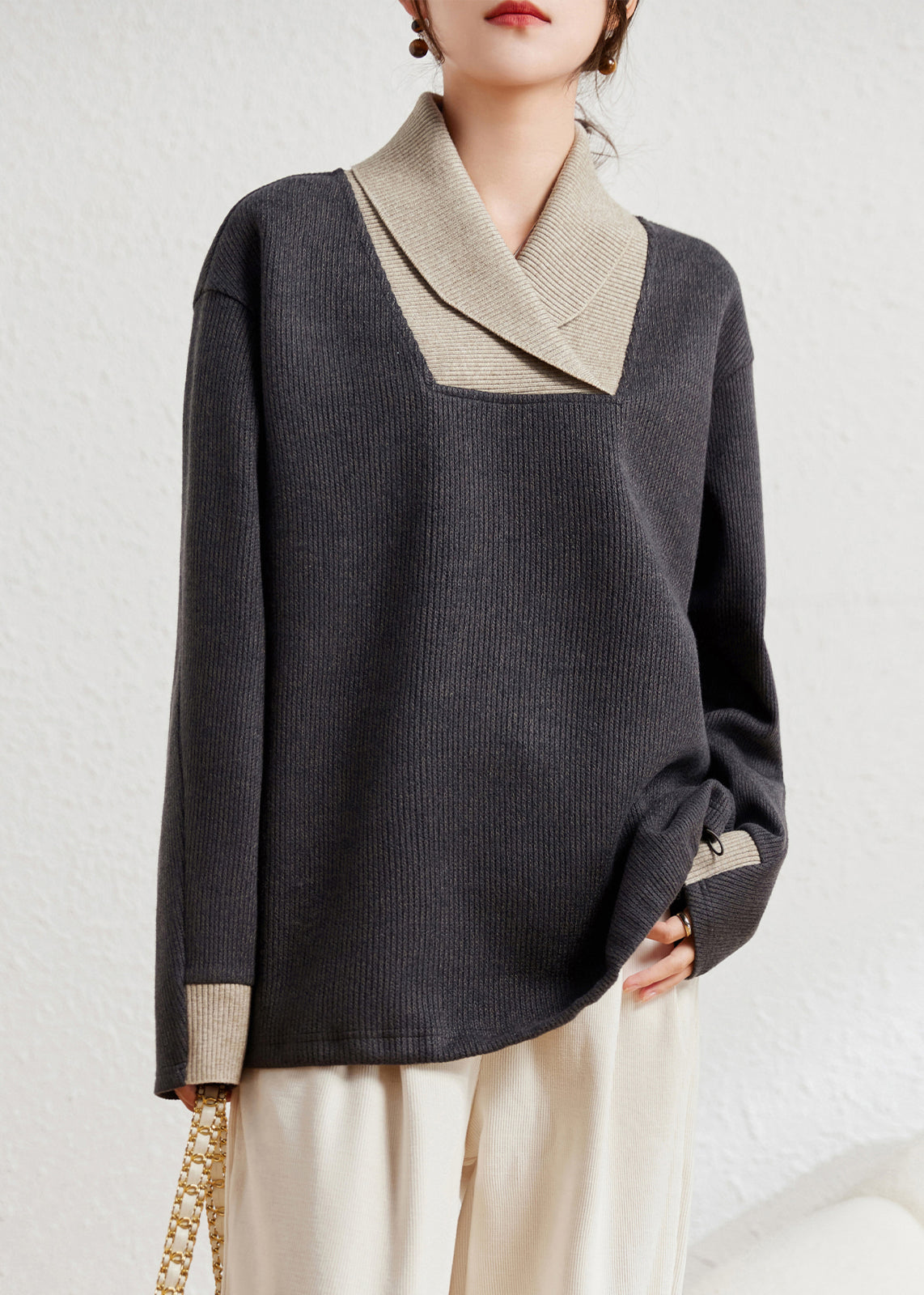 Casual Grey Peter Pan Collar Patchwork Knit Sweater Winter