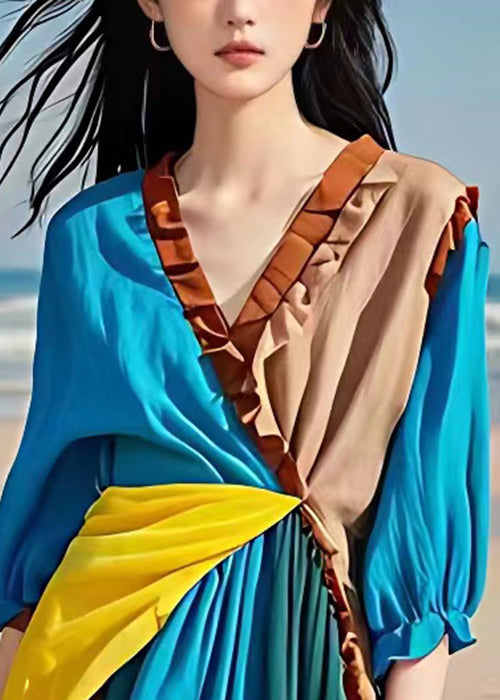 Chic Blue Ruffled Patchwork Cotton Long Dresses Half Sleeve