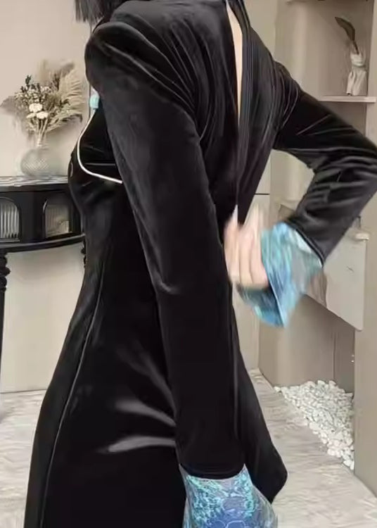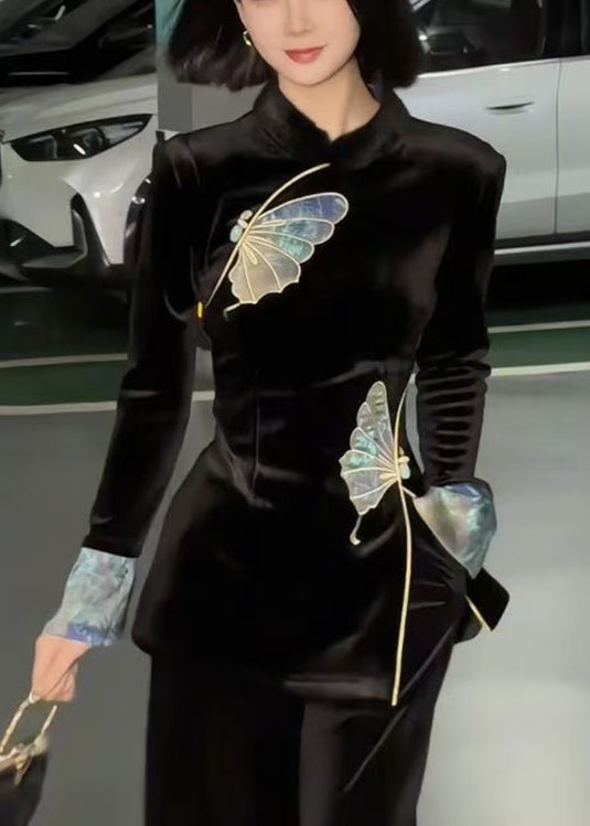 Chinese Style Black Stand Collar Embroidered Velour Two Pieces Set Spring