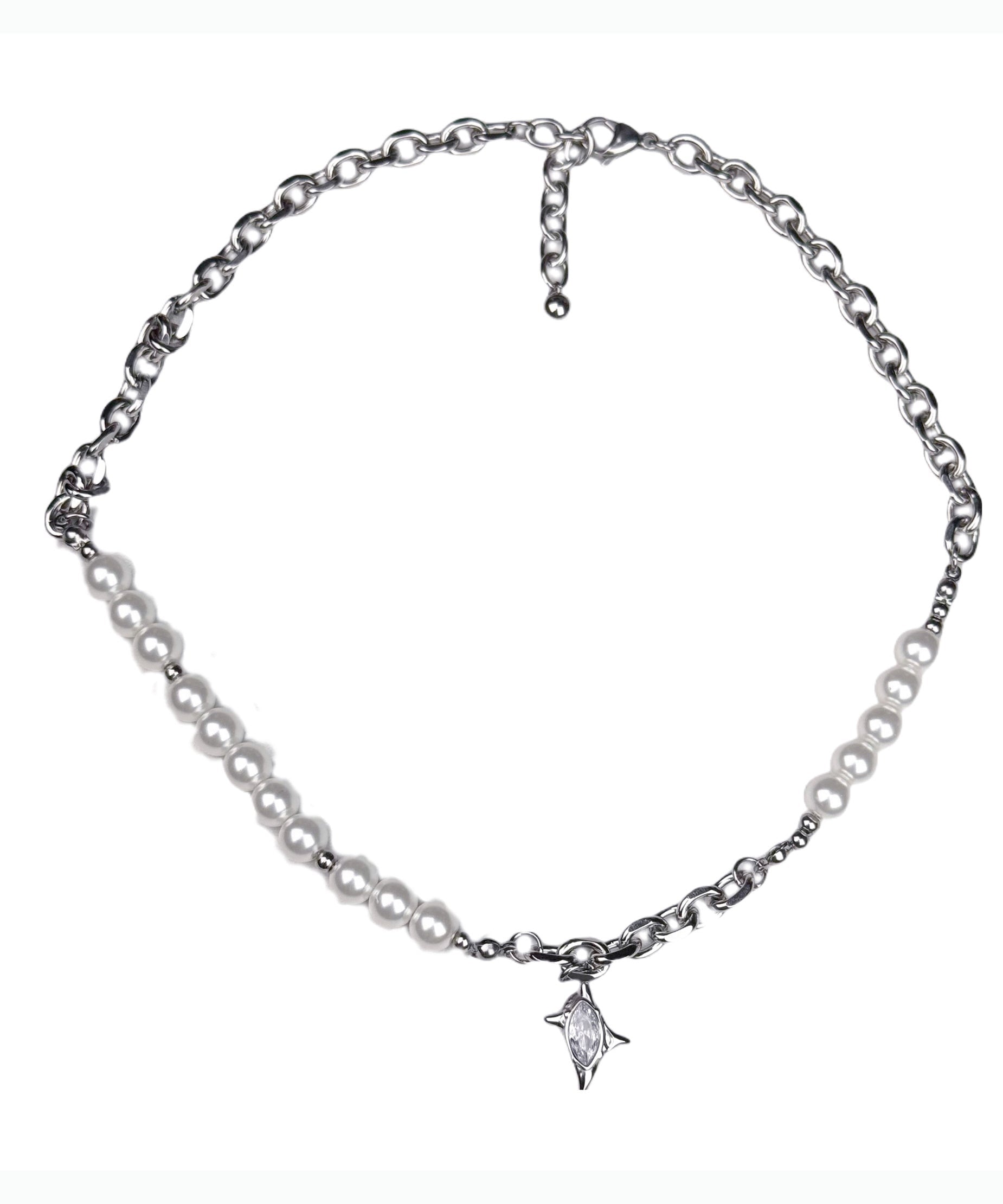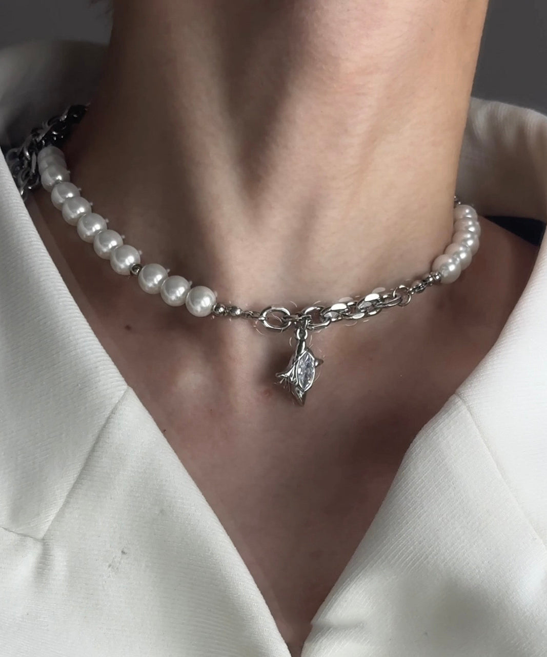 Classy White Pearl Patchwork Tungsten Steel Zircon Pendant Choker