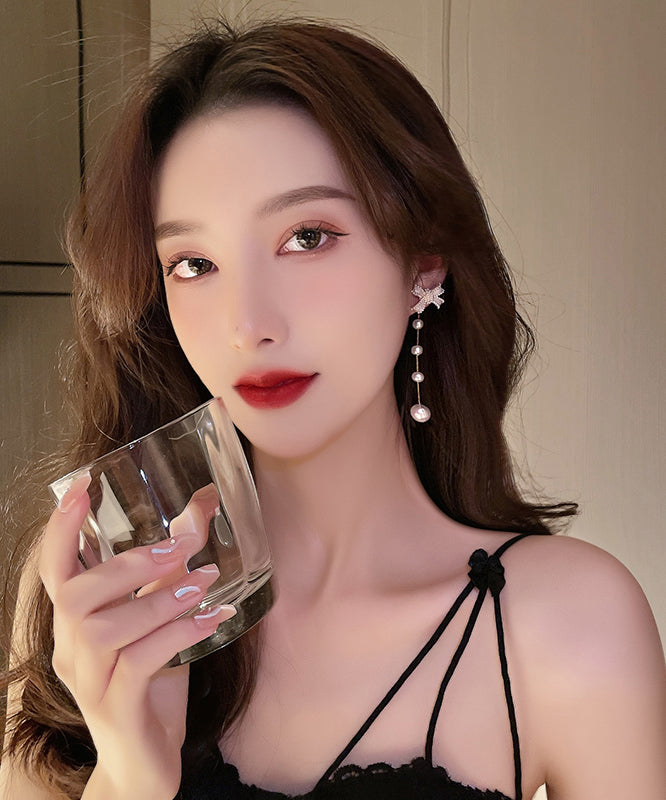 Cute White Sterling Silver Alloy Bow Pearl Tassel Drop Earrings