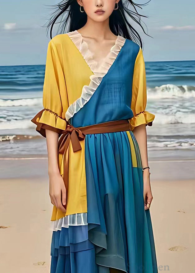 Elegant Blue Ruffled Tie Waist Patchwork Chiffon Dress Flare Sleeve