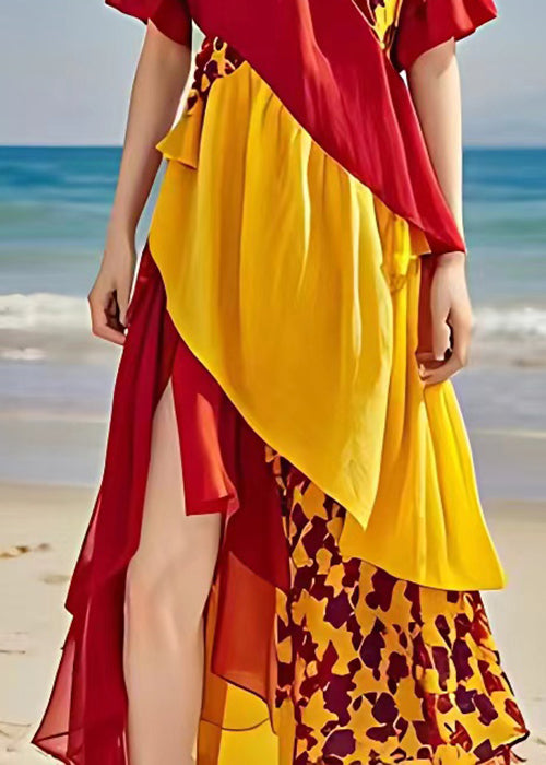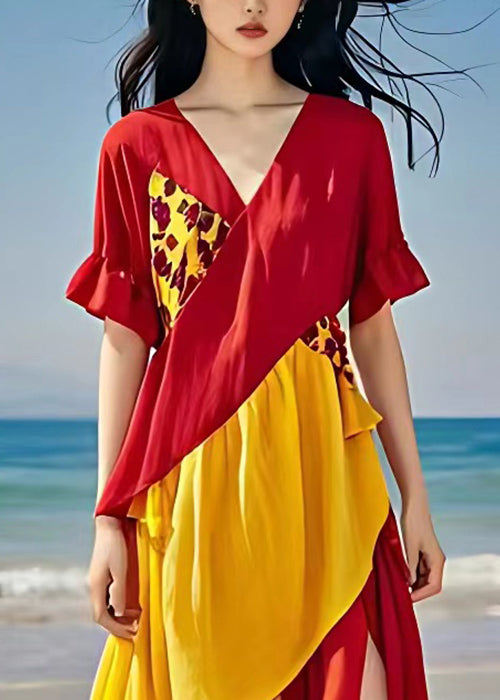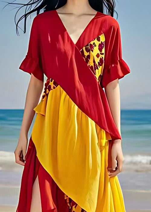 Elegant Red V Neck Print Side Open Cotton Dress Summer