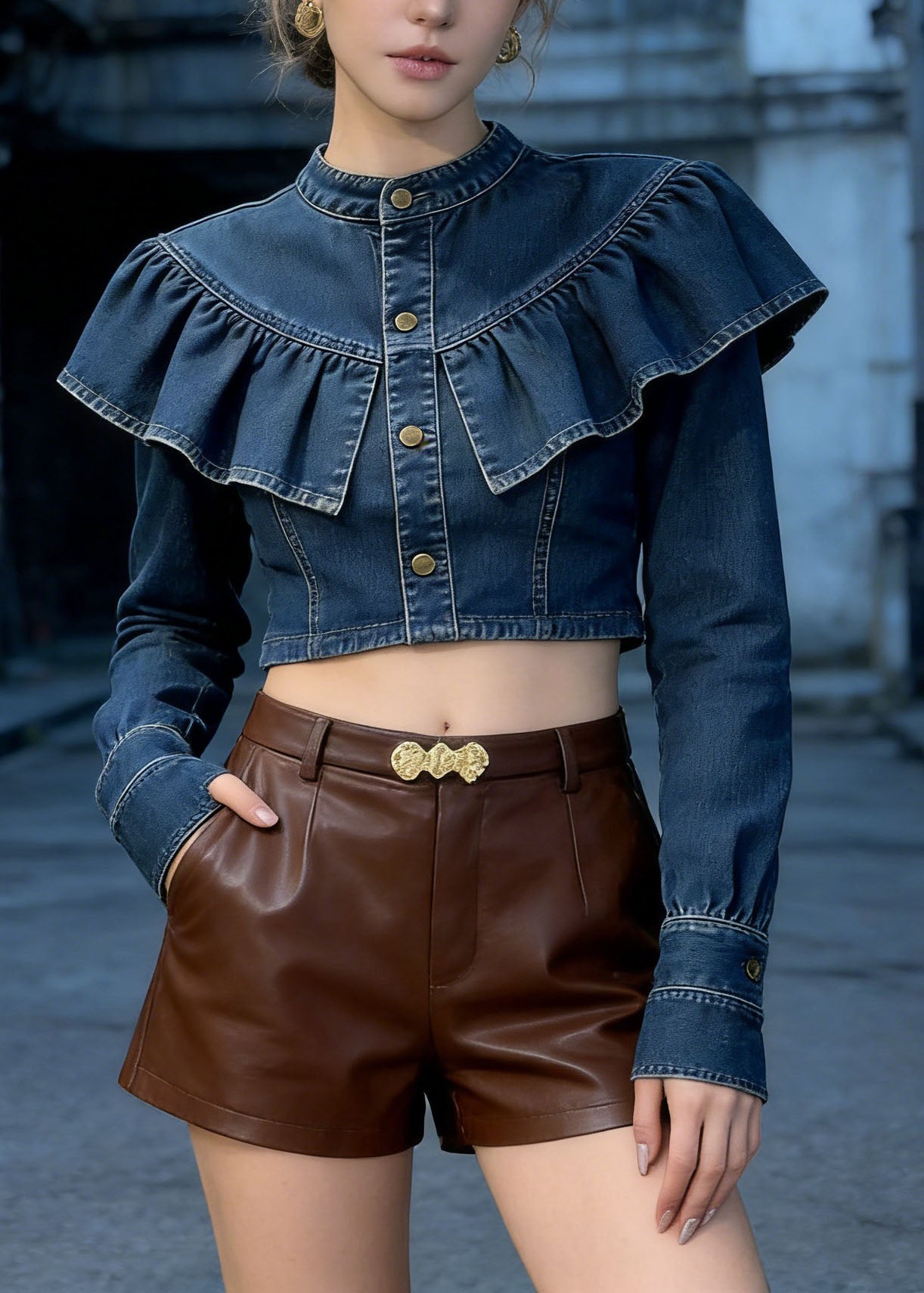 Fashion Blue Ruffled Patchwork Denim Short Top Spring