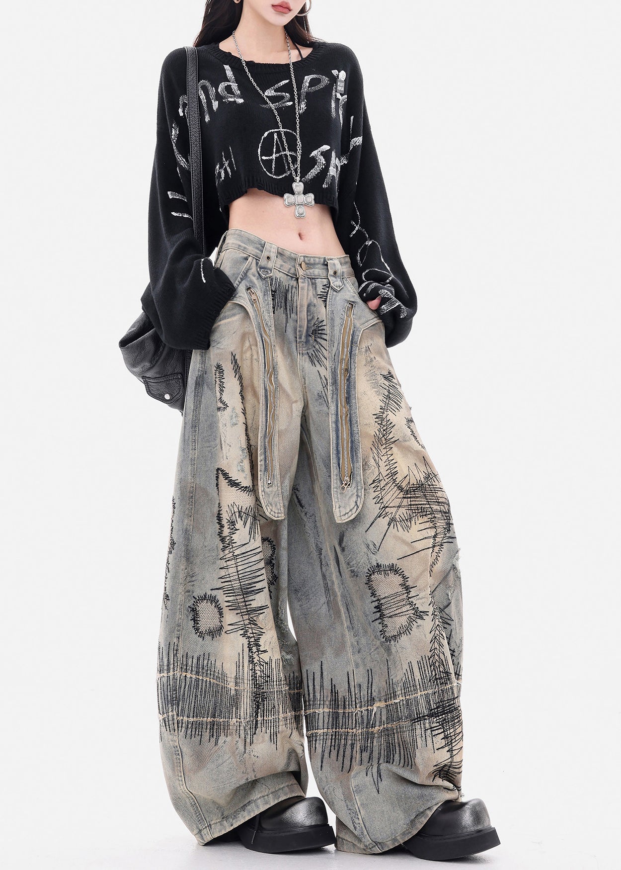 Fashion Grey Embroidered Denim Wide Leg Pants Spring
